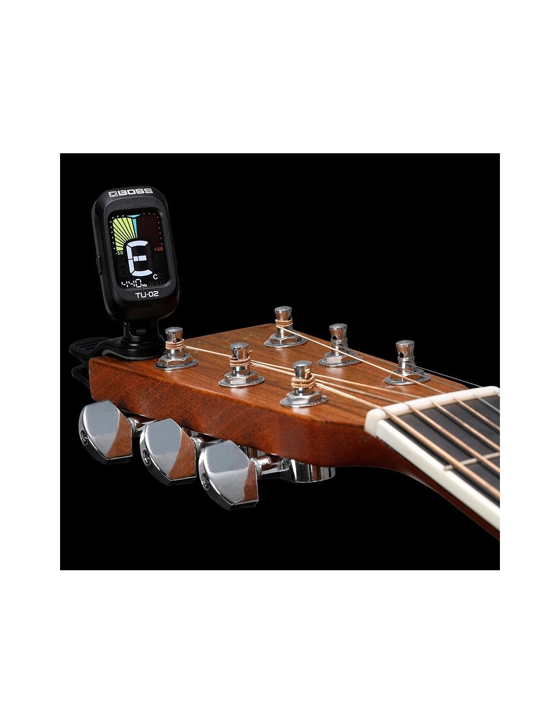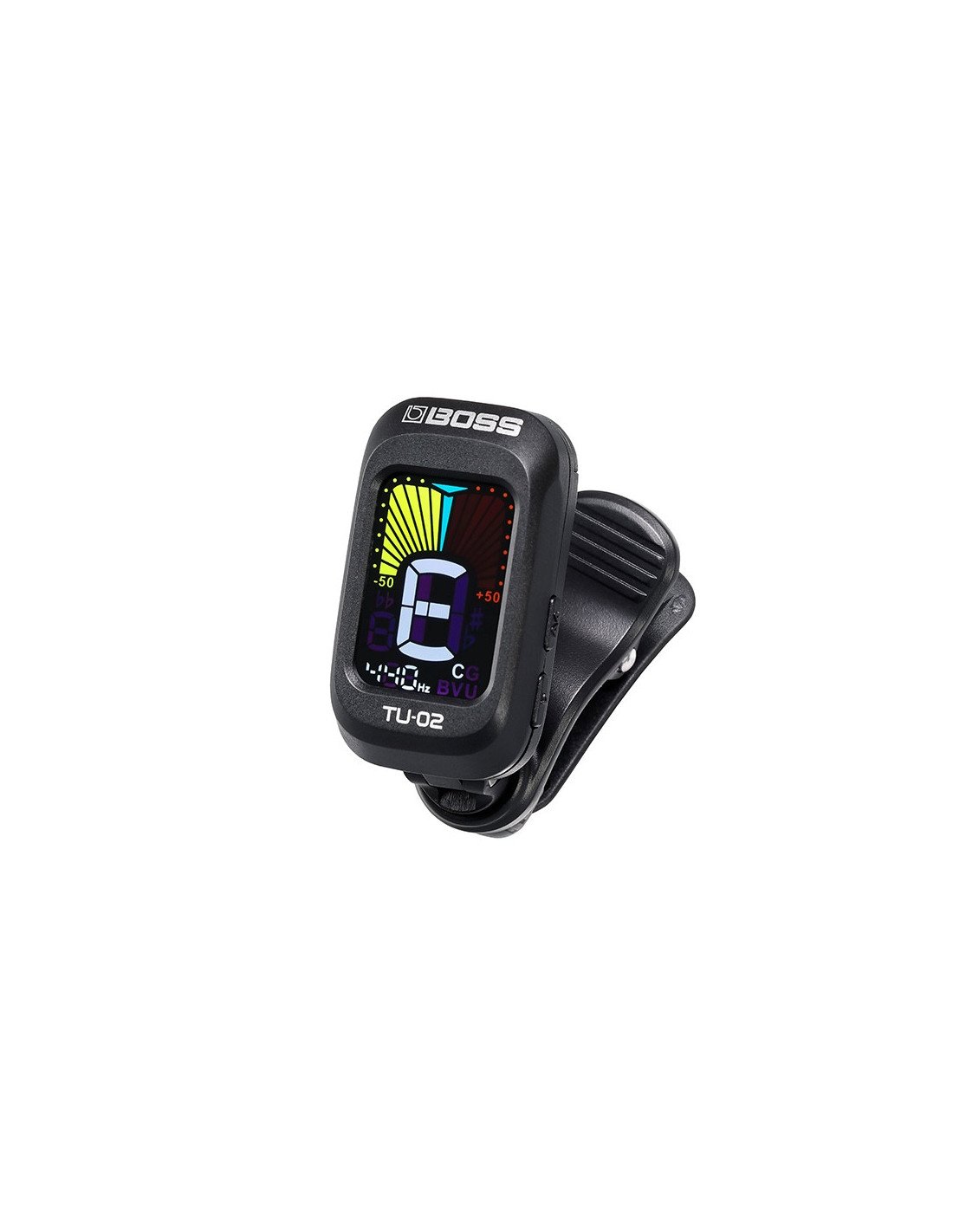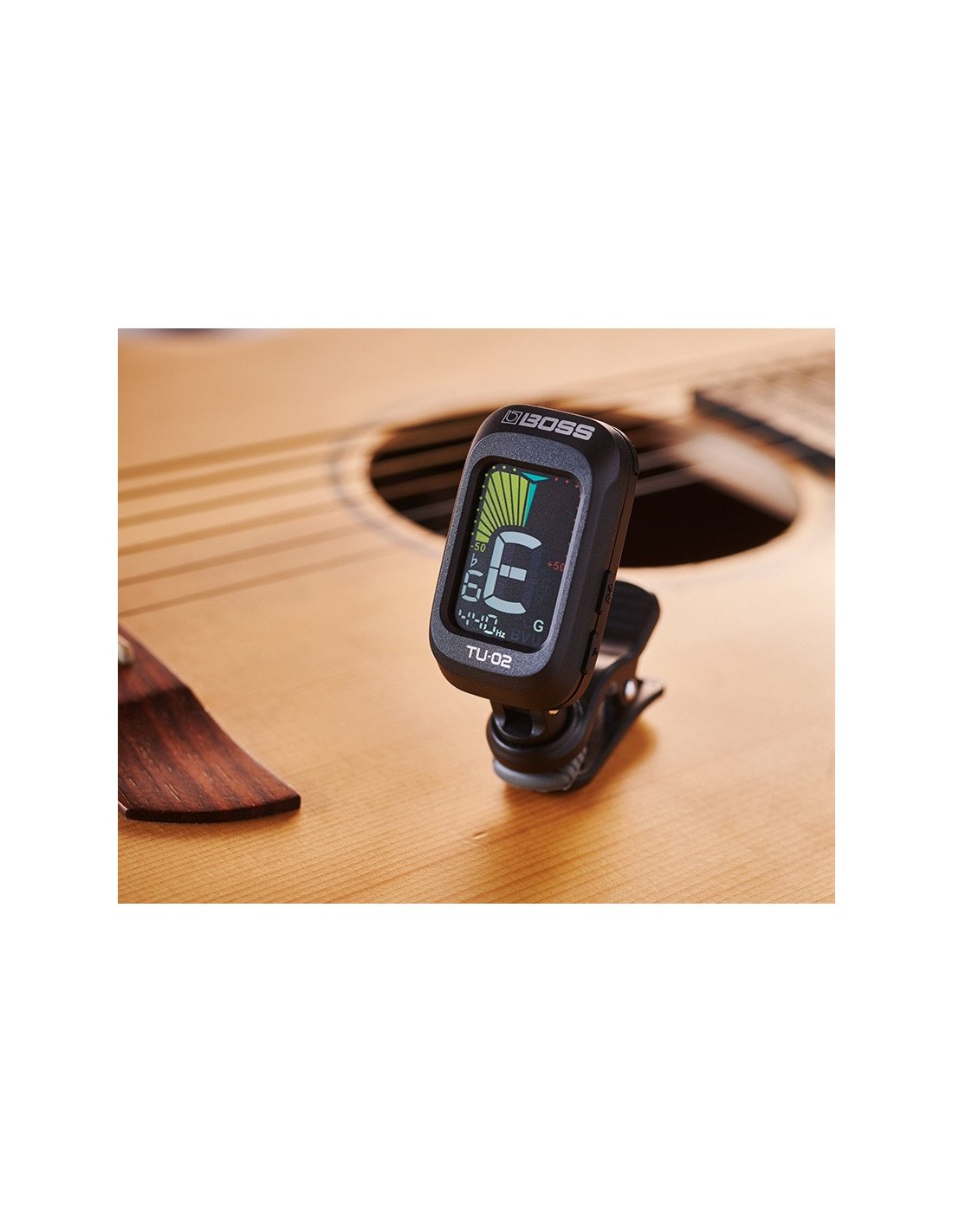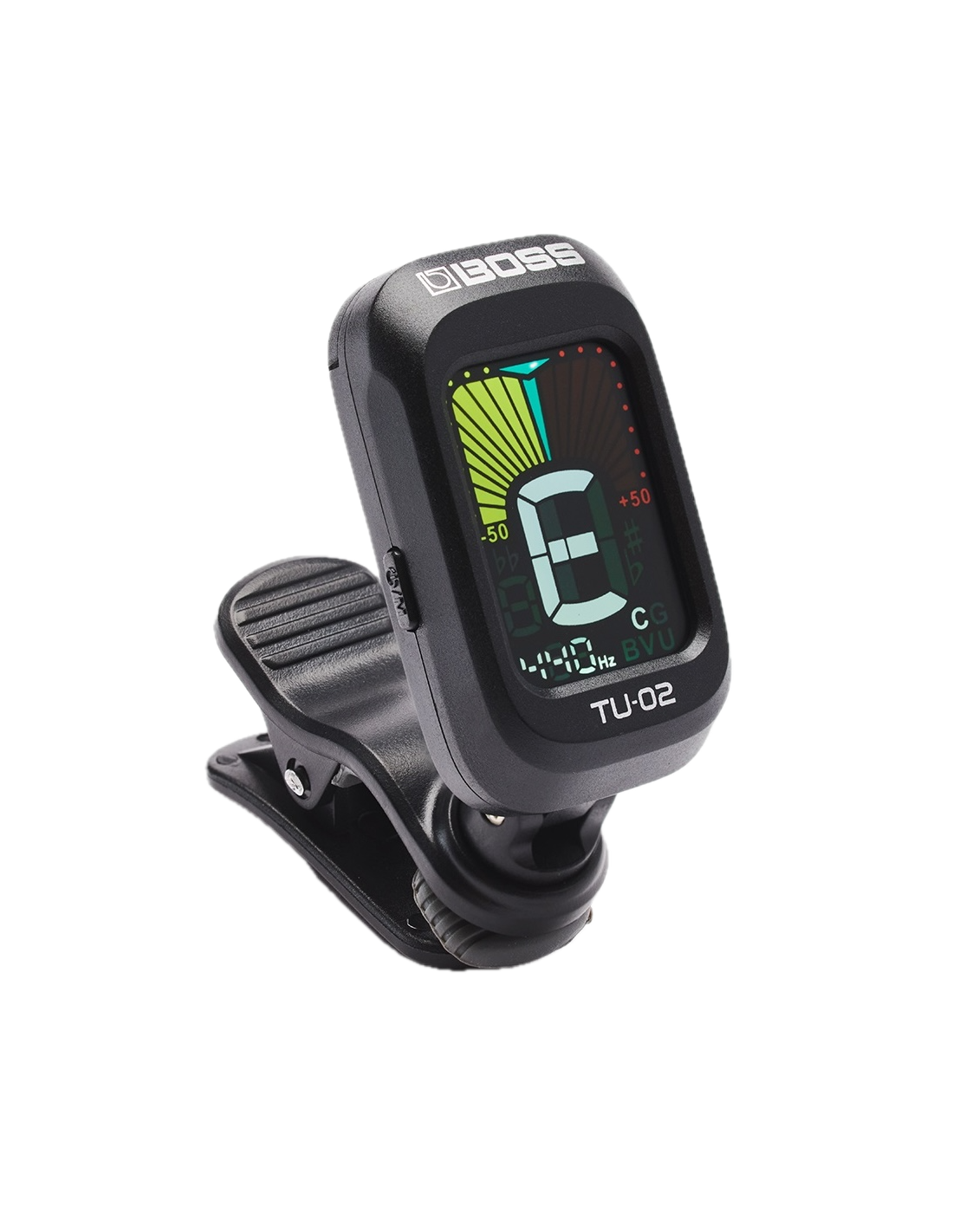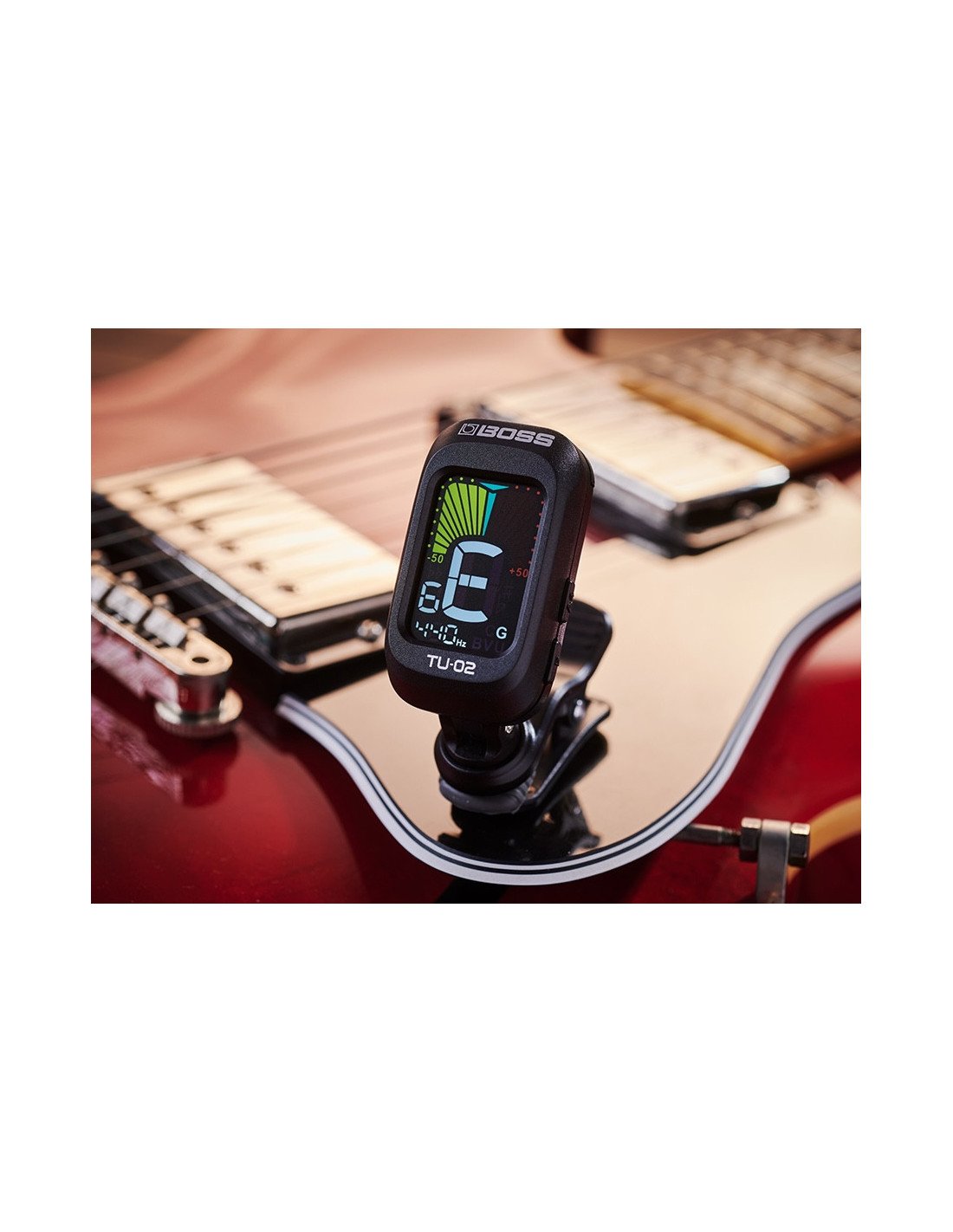 Afinador de pinza cromatico BOSS TU-02 Es el afinador de pinza definitivo para guitarristas, bajistas, ukelelistas y músicos versátiles que no quieren perder ni un centavo en precisión. Con su pantalla a color de alto contraste y ángulo de visión ajustable, afinar tu instrumento es más rápido, claro y confiable que nunca. Cuatro modos de afinación profesionales, calibración ajustable y hasta 24 h de uso continuo hacen de este afinador una herramienta indispensable para práctica, clase o presentaciones en vivo.