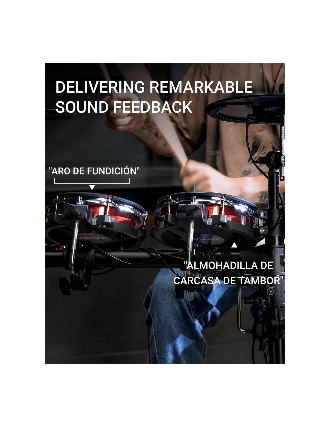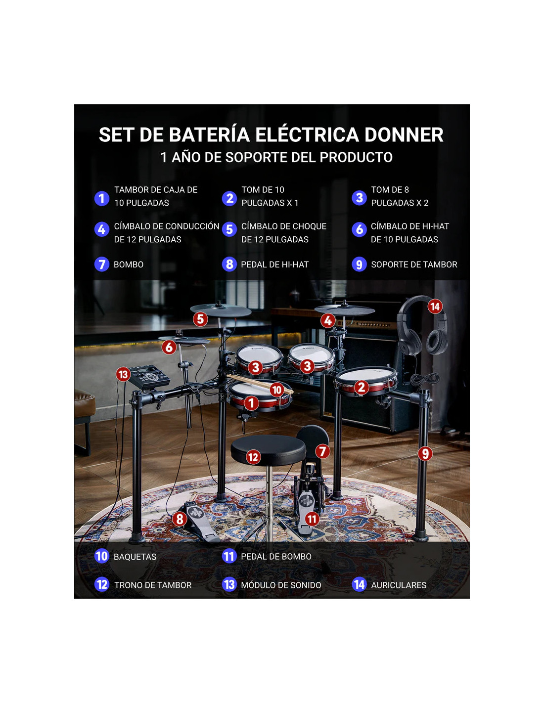 Además, incluye acceso a la APP Donner Play y una prueba con 40 lecciones de batería en Melodics, para que aprendas paso a paso con ejercicios guiados y canciones.