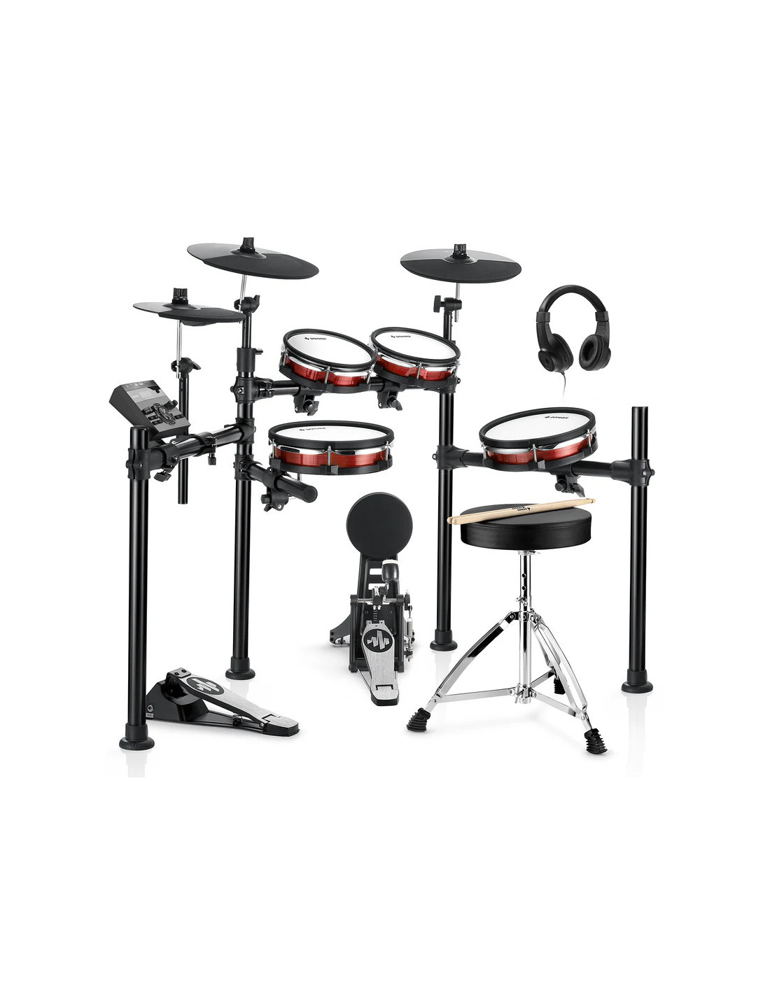 Viene lista para tocar desde que la sacas de la caja: rack metálico plegable, control de hi-hat, pedal de bombo, auriculares, trono de batería, cable de audio y baquetas incluidosSolo conéctala, pon tus audífonos o tu amplificador y empieza a tocar.