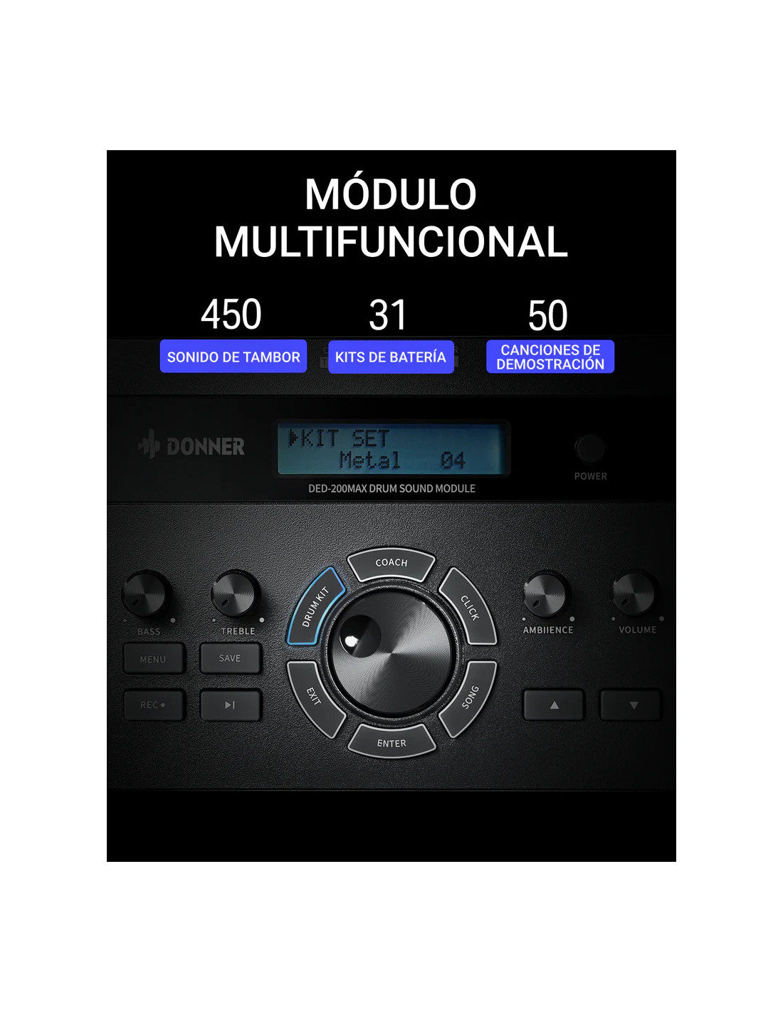 DonnerLa Donner DED-200 MAX EC6782 es una batería electrónica completa con 5 tambores y 3 platillos, pensada para que principiantes y aficionados serios practiquen en casa con sensación realista y volumen controlado. Sus parches de malla de doble capa Nivel 2 ofrecen un rebote muy similar al de una batería acústica, con una respuesta dinámica precisa. La caja de 10", el tom de piso de 10", el hi-hat de 10" y los platillos crash/ride de 12" con función de apagado (choke) te dan una superficie amplia y cómoda para tocar, con detección de golpes más expresiva.