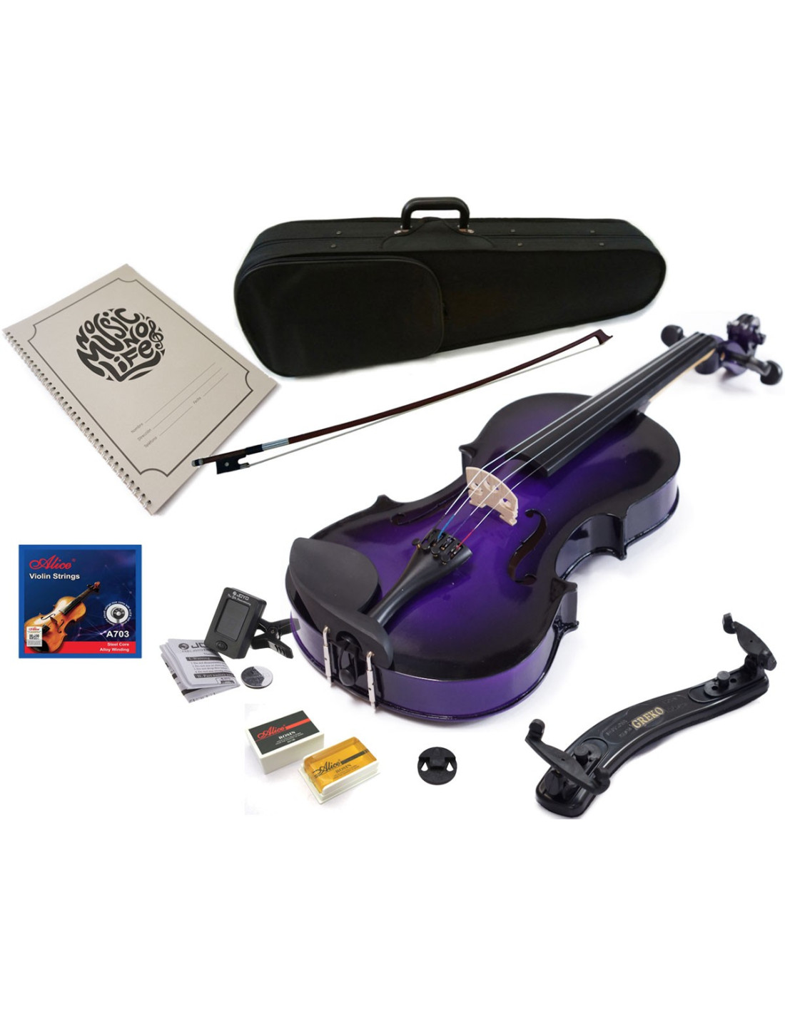 Kit completo de Violin 4/4 en hermoso color Violeta degradado a negro. Este hermoso instrumento vienen con estuche semi-duro, arco, colofonia, almohadilla, afinador digital, soporte retráctil, limpiador y encordado completo adicional. Buen sonido y desempeño, estética muy bien lograda, ideal para comenzar en el magnifico mundo de este instrumento musical. Trae todo lo necesario para que comiences a tocar desde el primer momento.