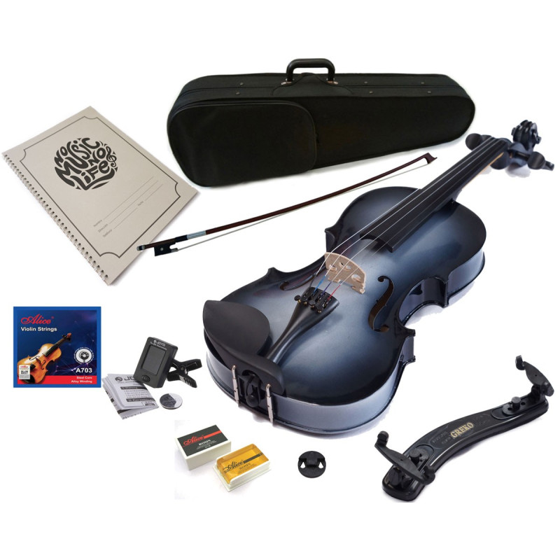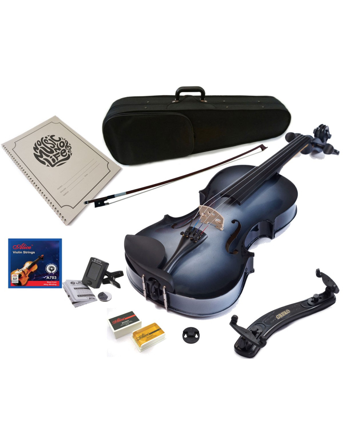Kit completo de Violin 4/4 en hermoso acabado en color gris degradado a negro. Este hermoso instrumento vienen con estuche semi-duro, arco, colofonia, almohadilla, afinador digital, soporte retráctil, limpiador y encordado completo adicional. Buen sonido y desempeño, estética muy bien lograda, ideal para comenzar en el magnifico mundo de este instrumento musical. Trae todo lo necesario para que comiences a tocar desde el primer momento.