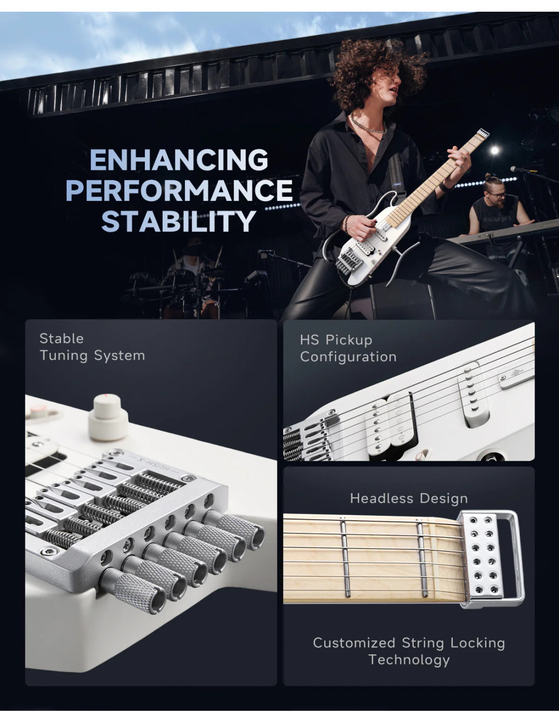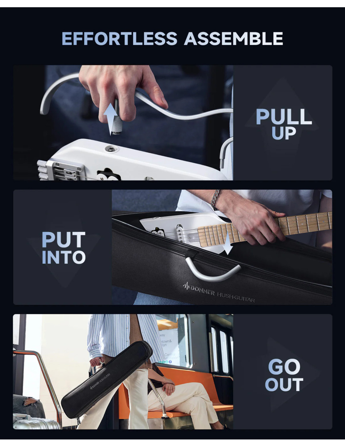 DonnerLa DONNER HUSH-X WH EC6809 en hermoso acabado color blanco, es tu guitarra “llévala a todas partes”: cuerpo compacto headless de solo 4.4 lb (≈2 kg), escala completa 25.5”, y circuito activo/pasivo con pastillas H-S para pasar de limpios brillantes a drives con pegada. Conecta audífonos o tu amplificador y toca en hotel, backstage o casa sin molestar a nadie. Incluye bolso de transporte y accesorios para empezar de inmediato.