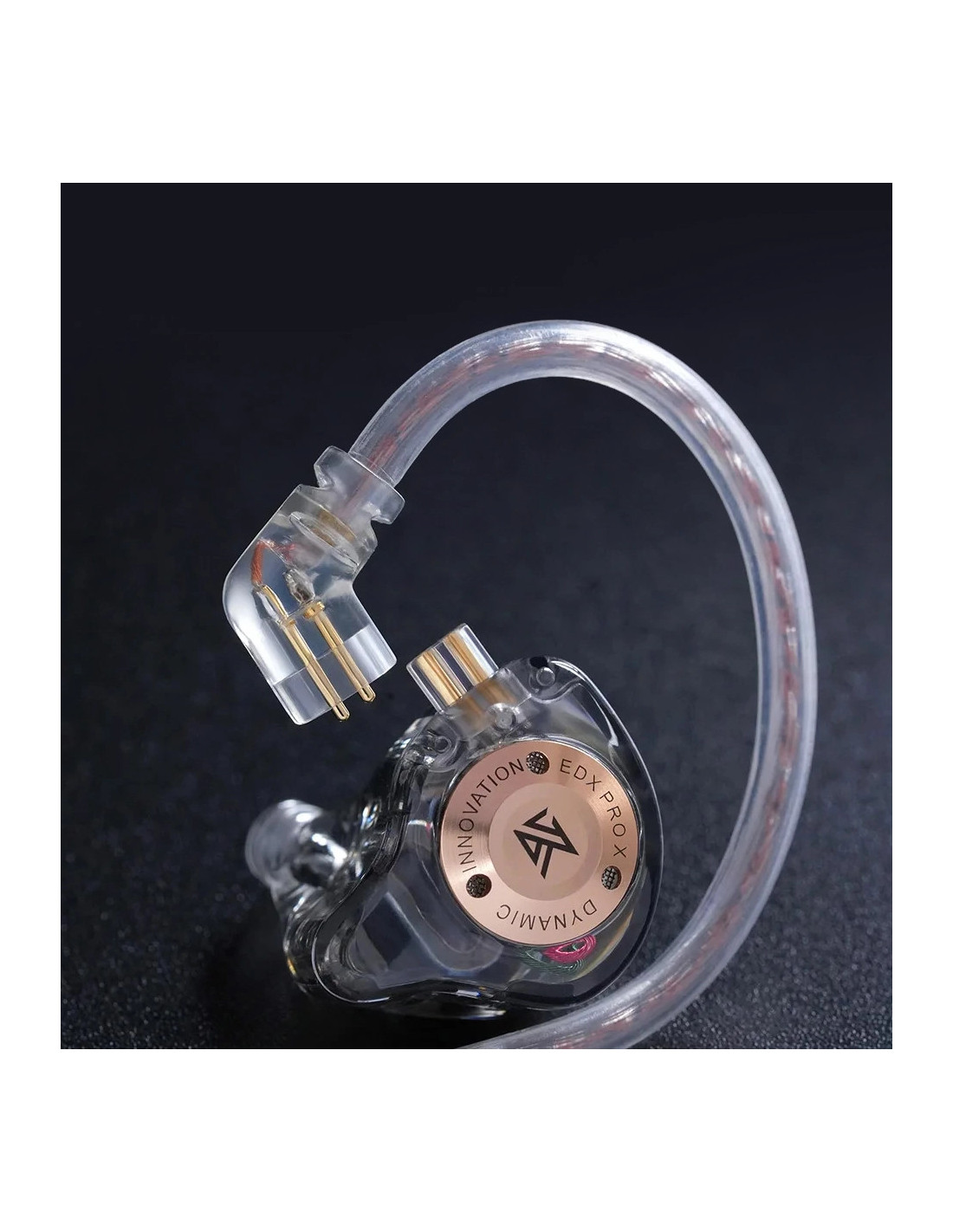 Gracias a su controlador dinámico superlineal y su cámara acústica de alta precisión, los KZ EDX Pro X ofrecen un rendimiento de audio excepcional con bajos profundos y potentes, tonos medios claros y agudos nítidos, logrando una experiencia auditiva envolvente y equilibrada. Su diseño transparente de resina combinado con detalles metálicos no solo aporta ligereza y durabilidad, sino también un toque moderno y sofisticado.