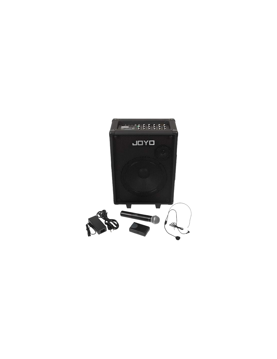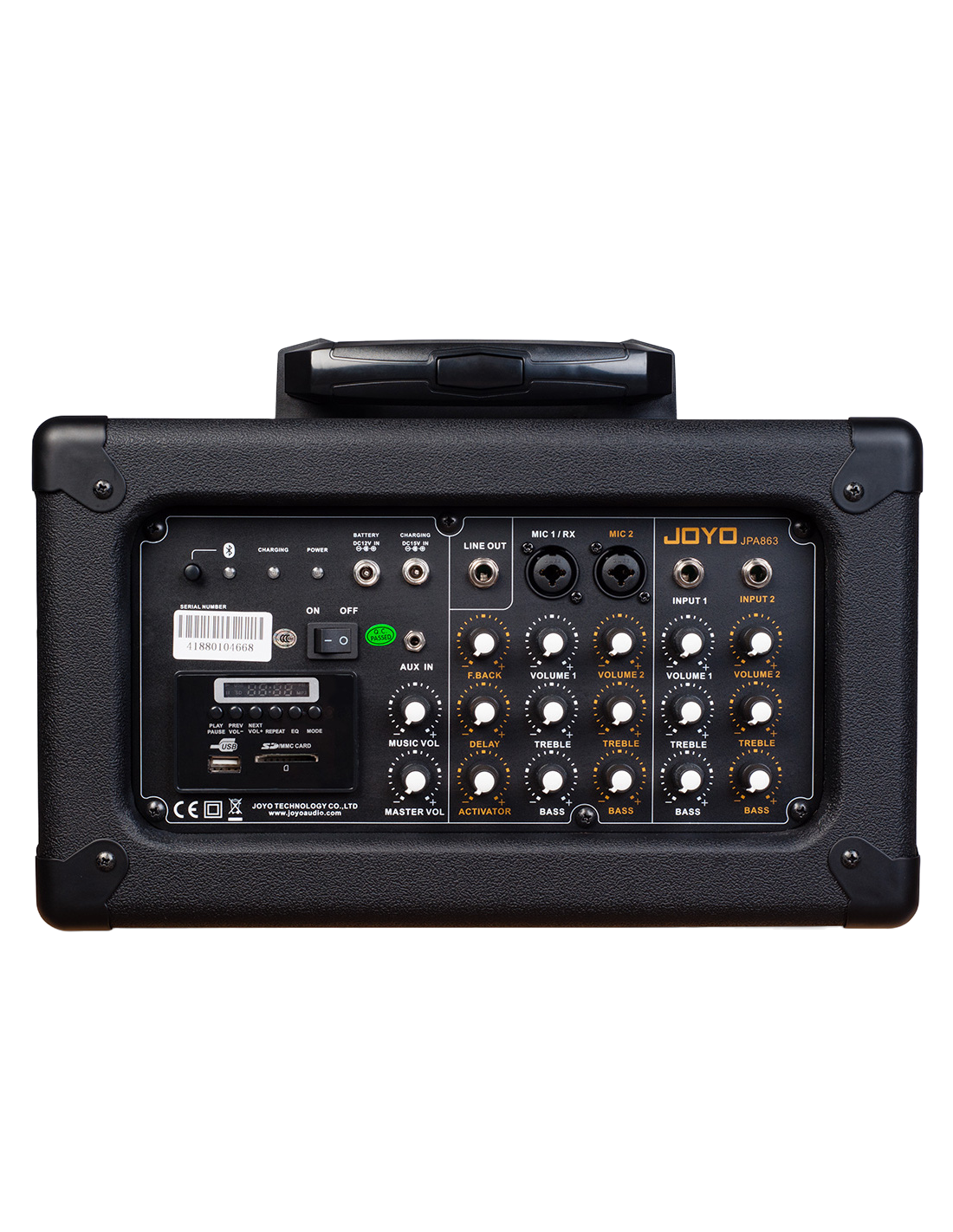 Amplificador JOYO JPA-863. Es un amplificador de busking con Bluetooth y batería recargable. Incluye micrófono inalámbrico. Cuenta con un chip amplificador de potencia Clase D de doble canal, con una potencia de salida de 30W (RMS). El chip amplificador de potencia de Clase D se caracteriza por su alta eficiencia y ahorro de energía, lo que mejora la durabilidad de la batería. También incluye un altavoz emparejado de 10" y otro de 3", ambos con una resistencia de 4 ohmios. Con una batería recargable incorporada, asegura su ligereza y portabilidad, lo que lo hace ideal para pequeños espacios como clubes, casas y/o estudios. Además, cuenta con funciones AUX IN y Player, junto con la función Bluetooth, lo que lo convierte en tu mejor compañero. Excelente sonido y desempeño.