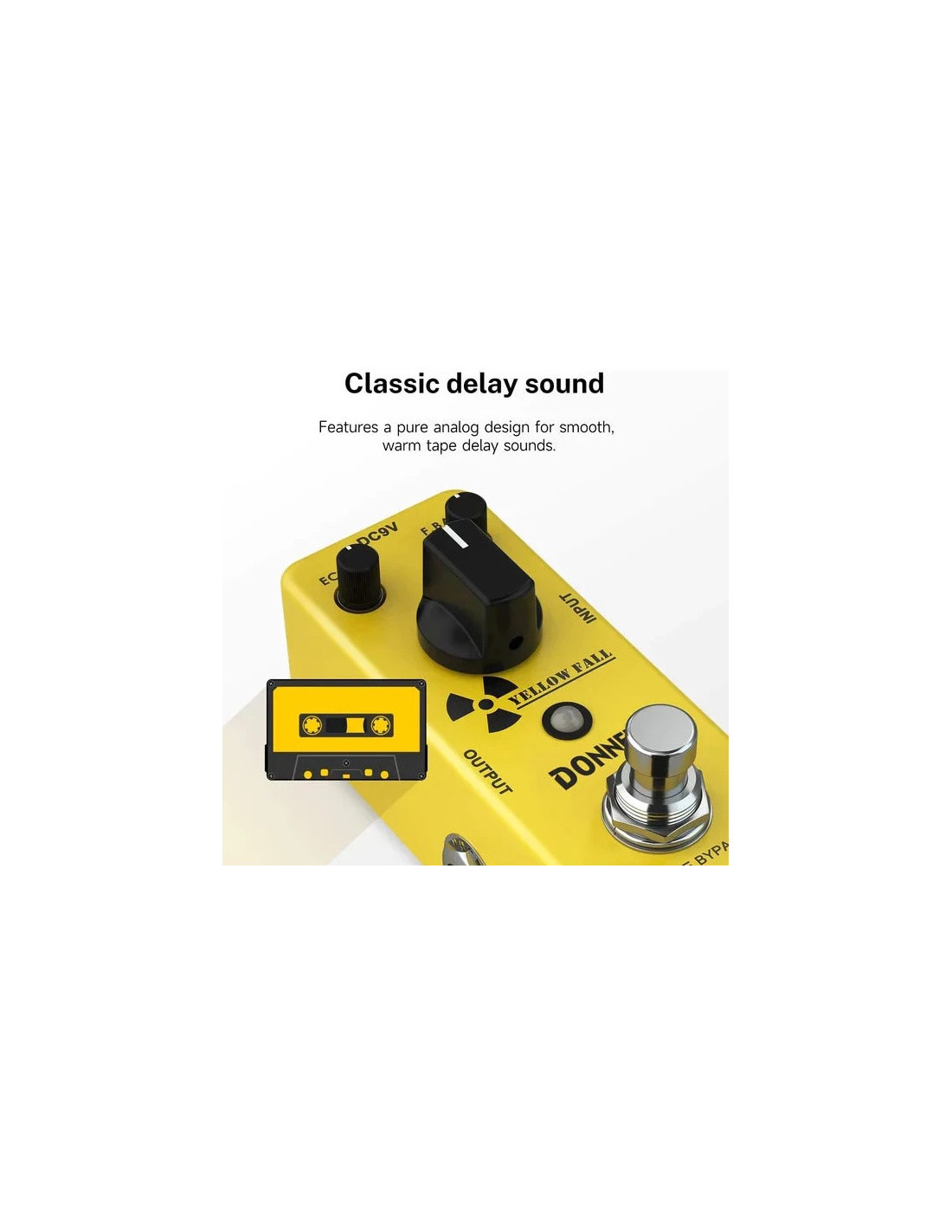DonnerPedal de efecto DONNER EC748 YELLOW FALL para guitarra electrica. Este innovador stompbox es un pedal de efecto analógico que ofrece un sonido de delay cálido y suave, ideal para guitarristas que buscan un tono clásico. Con un diseño compacto y controles intuitivos, permite ajustar fácilmente el tiempo de delay, la cantidad de repeticiones y el nivel de efecto. Su circuito analógico puro, combinado con componentes de alta calidad, garantiza una respuesta sonora rica y natural, perfecta para géneros como jazz, rock y pop.
