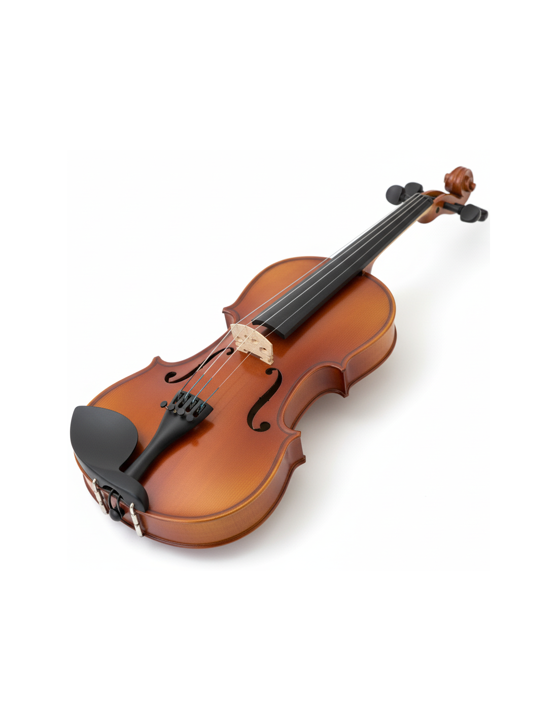 Violin GREKO MV1413 3/4. Pensado para estudio y práctica diaria. Su tapa de abeto laminado aporta un timbre equilibrado y estable, mientras que el cuerpo, diapasón, mentonera (apoyabarbilla) y puente de madera ofrecen una sensación tradicional al tocar.